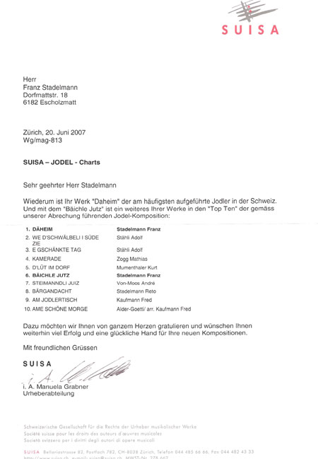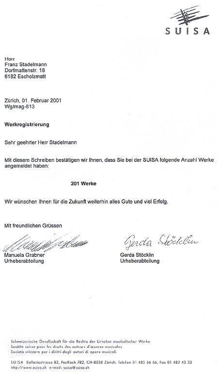 Am 01. Februar 2001 hatte Franz Stadelmann 201 Werke bei der SUISA angemeldet.